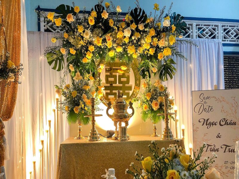 Trang trí kèm theo: Tên cô dâu chú rể, chữ hỷ, hoa, đèn led, ảnh cưới… đều có thể sử dụng tone vàng nhằm mang lại sự nhất quán và cuốn hút cho không gian.