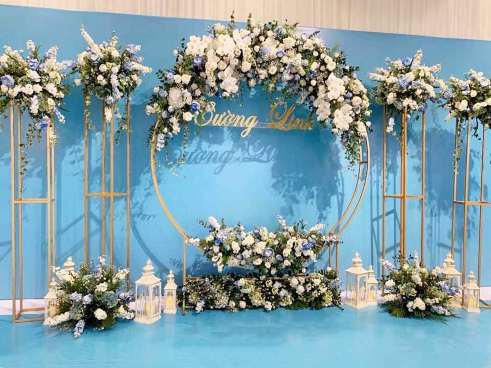 Một combo màu tươi mới và dễ chịu. Màu xanh dương tạo ra cảm giác bình yên và mát mẻ, trong khi màu trắng làm tôn lên sự tinh tế và trong trẻo. Đây là một lựa chọn tuyệt vời cho những buổi tiệc cưới ngoài trời trong ngày hè.