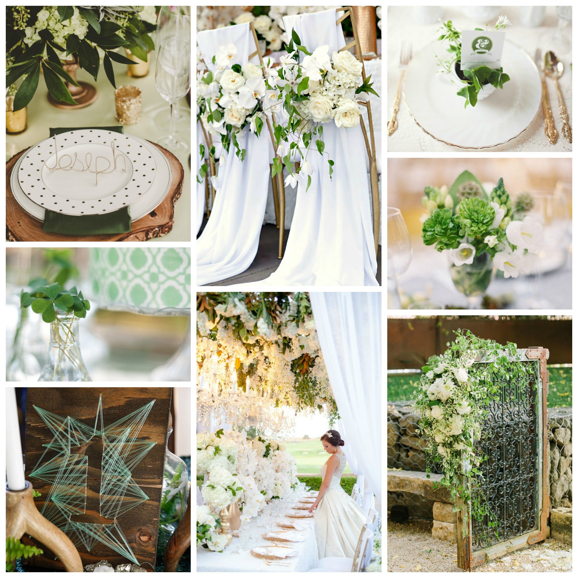 Các đôi có thể tận dụng những sắc độ từ trắng đến ngà kem, với bản chất hòa nhã làm màu nền cho không gian cổng, hoa lối đi, thiệp mời, váy cưới; sau đó ươm ngỏ màu xanh đắt giá bằng kỹ thuật xử lý phủ xanh ánh bạc thời thượng (đối với các ấn phẩm in), phụ kiện trang sức màu lục bảo cho cô dâu, đệm cùng lá tùng nho, dương xỉ xuyên suốt. Tuy điều này có vẻ chỉ cho mọi công thức chuẩn mực, không nhấn nhá nhiều cao trào, nhưng bạn có thể kết hợp thêm những thiết kế dạng hình học, hay triển khai trong không gian mang tông gỗ trầm ấm để tạo nên tổng thể hoàn chỉnh.