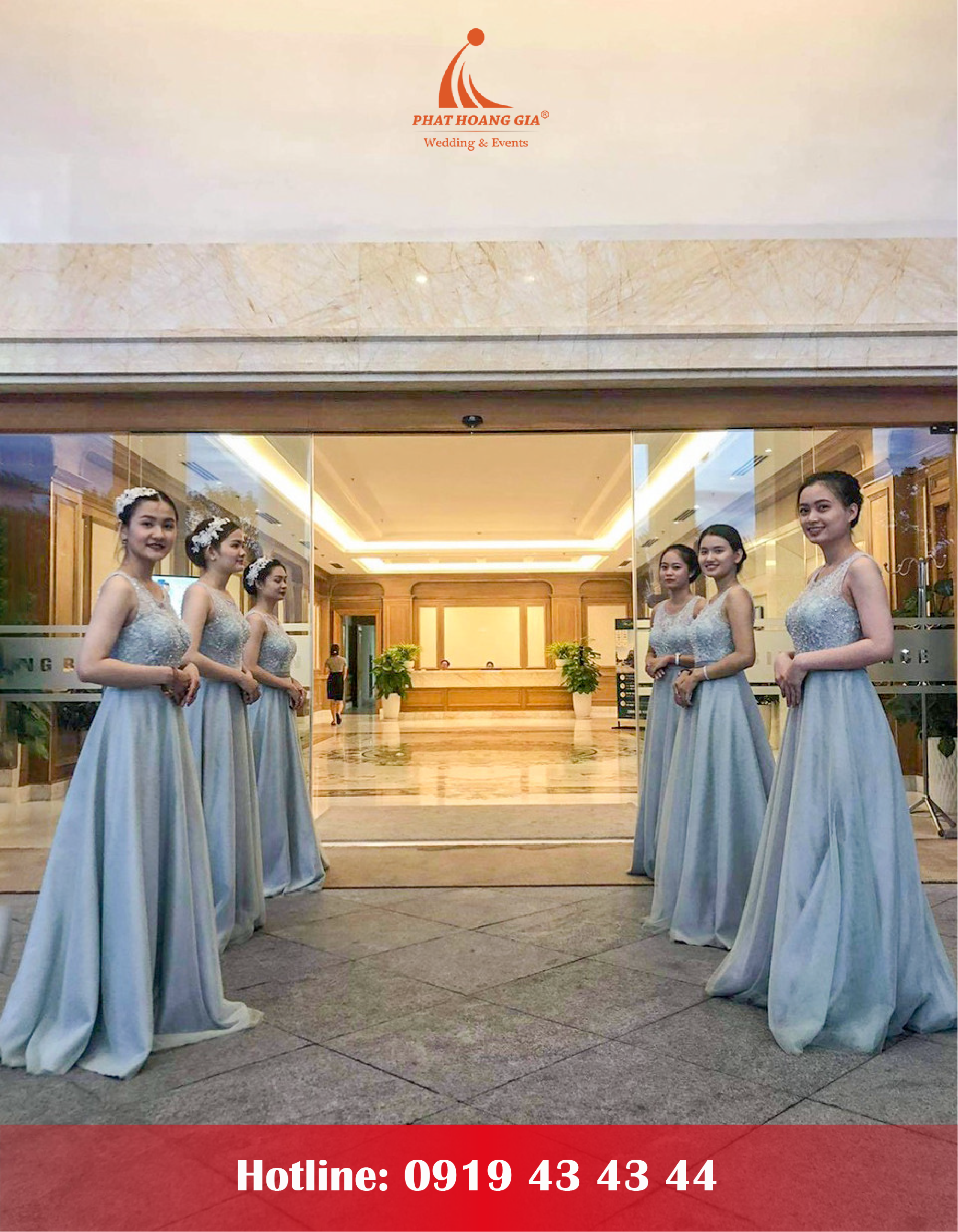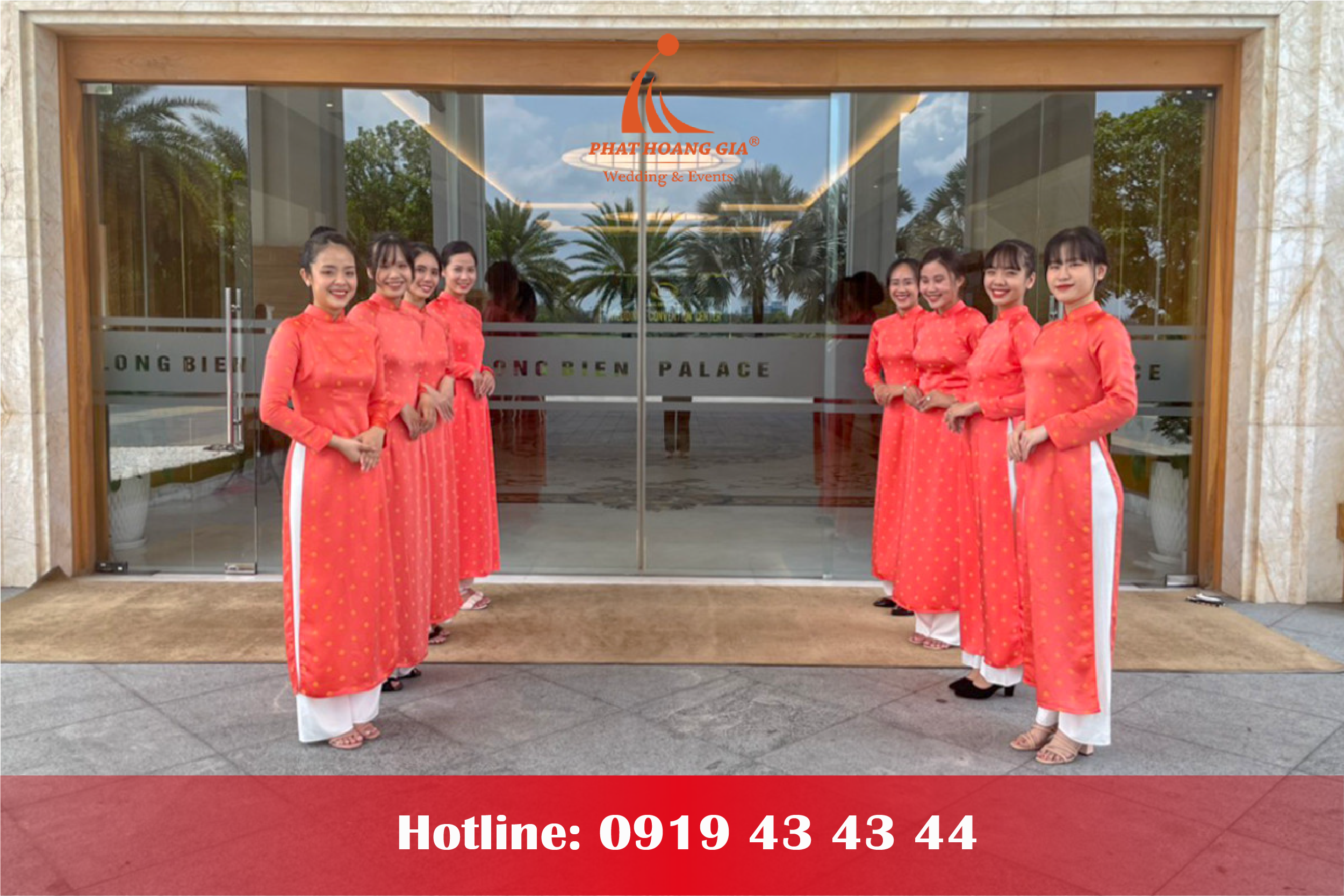 Đứng tại khu vực sảnh chính hoặc lối đi vào trung tâm hội nghị tiệc cưới với nụ cười thân thiện chào đón và hướng dẫn khách mời vào khu vực diễn ra buổi tiệc cưới