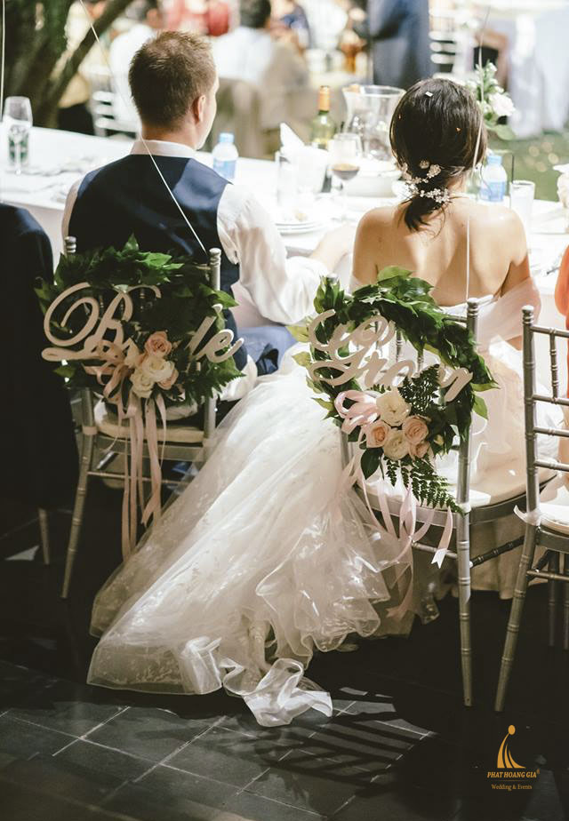 Bàn tiệc của hai bên gia đình được bày trí với ghế tiffany. Trên bàn tiệc Phát Hoàng Gia cũng sử dụng runner ren trải dọc bàn cùng những bình hoa thủy tinh nhỏ nhắn mang sắc hồng ngọt ngào. Điểm nhấn là vị trí ghế ngồi của cô dâu chú rể, được trang trí lồng tên và lá cây xanh thêm phần bắt mắt.